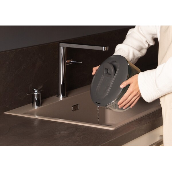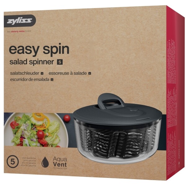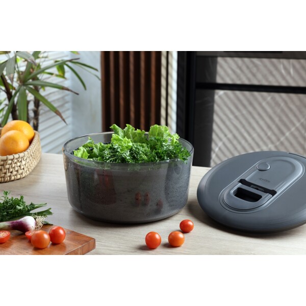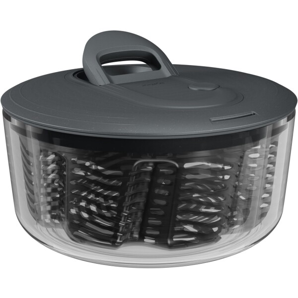 Med vores salatslynge vasker og tørrer du din salat på få sekunder. Den unikke, patenterede AquaVent TM-kurv drænerer vandet særligt effektivt og tørrer derfor de friske urter ekstra hurtigt og skånsomt. Takket være den skridsikre fod på skålens bund sidder den praktiske køkkenhjælper sikkert på plads, selv under kraftig centrifugering. Den elegante skål af rustfrit stål eller krystalklar SAN-plast er også fremragende til at servere den færdige salat i. Dette eliminerer behovet for at købe yderligere produkter og beskytter dermed vores miljø. Du driver salatslyngen ved at trække i det udfoldelige håndtag. Håndtaget klikker fast i låget efter brug ved hjælp af en magnetklemme. Derfor er salatslyngen