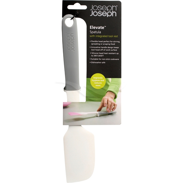 Spatel/dejskraber der er fremstillet af hærdet nylon med fleksibelt silikonehoved. Brug den til at røre eller sprede med, eller til at tage mad op og blande det i skåle eller andre beholdere. Perfekt at bruge sammen med non stick-køkkenredskaber, og kan holde til temperaturer på helt op til 270 grader. Hele Elevate-sortimentet af køkkenredskaber har til formål at forbedre hygiejnen og minimere roderi når redskaberne placeres på køkkenbordet under brug.Hvert eneste redskab har et grundigt afvejet håndtag med en integreret støtte, som sørger for at Elevate-redskabets hoved altid holdes op fra arbejdsoverfladen selvom redskabet lægges således at det peger nedad. Størrelse: 28 x 5 x 3 cm.