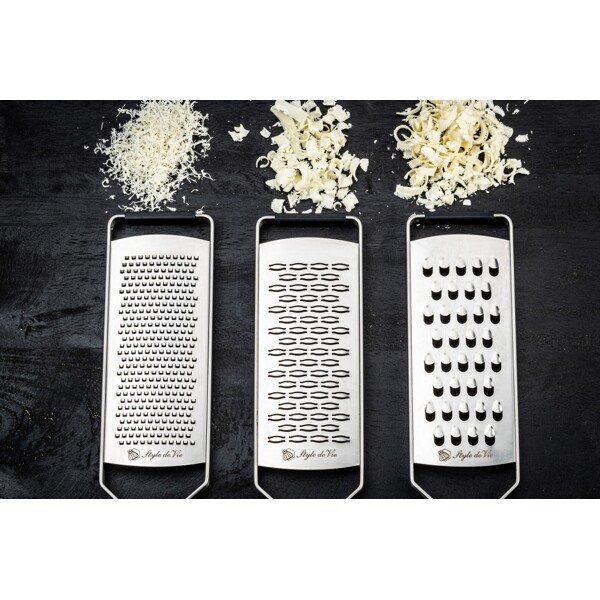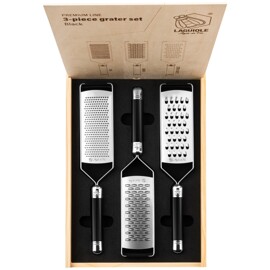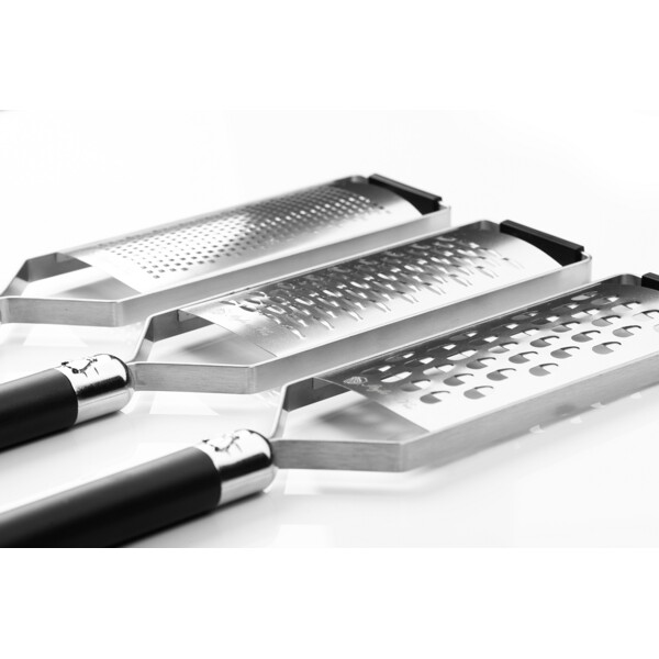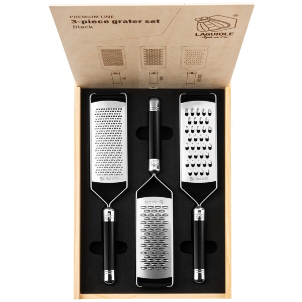 Et sæt med 3 dele fra Laguiole Style de Vie. Hvert rivejern har sin egen funktion, hvilket gør dette sæt meget alsidigt. Det fine rivejern bruges til eksempelvis citrus, chokolade, hårde oste og krydderier, mens det ekstra grove rivejern er bedst egnet til kartofler, kål, agurk, græskar, ost, pølse og æble. Båndvarianten er ideel til at rive krydderier, citrus, ost, ingefær, kokos og chokolade. Alle tre rivejern har en laserskåret bladflade i rustfrit stål. Rivejernene skæres med laserteknik, hvilket sikrer, at rivejernene er meget skarpe. Berig din kulinariske repertoire med dette meget funktionelle 3-delte rivesæt! Perfektion begynder med at bruge det rigtige værktøj! Pakket i en elegant trækasse, hvilket gør dette sæt også velegnet som gave.