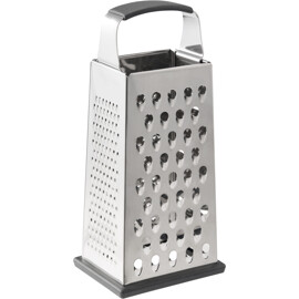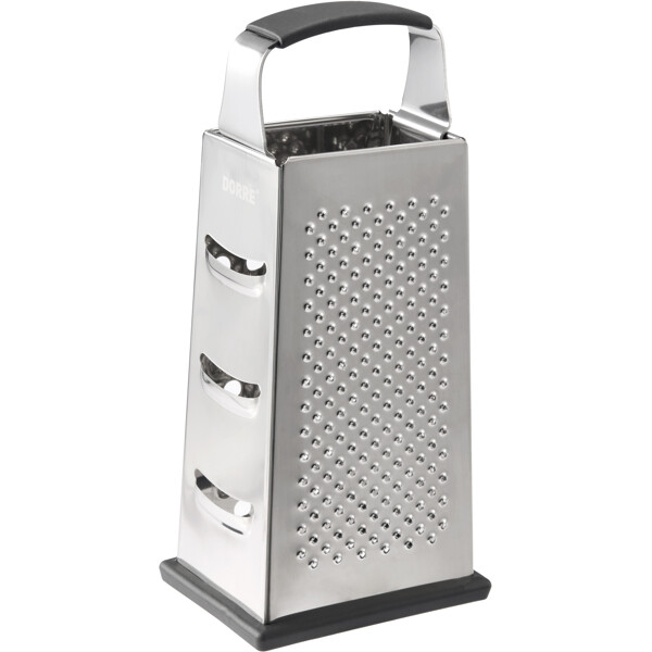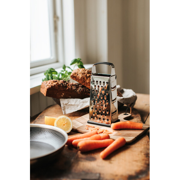 Praktisk firsidet rivejern med forskellige riveflader til ost, grøntsager og rodfrugter. Udstyret med gummifødder, der giver stabilitet på bordet, og et behageligt håndtag for sikkert greb. En slidstærk klassiker i køkkenet, der gør madlavningen enkel.
