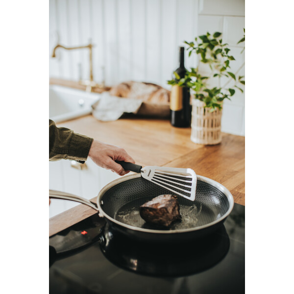 Denne stegepalet på 33 cm kombinerer funktion og skånsom håndtering. Den silikonebelagte spids beskytter dine non-stick-pander og sarte kogegrej mod ridser, samtidig med at den giver en effektiv og smidig anvendelse. Perfekt til at vende pandekager, omeletter eller delikate retter som fisk og grøntsager. Med sin længde på 33 cm er den ideel til både madlavning og servering. Det ergonomiske håndtag giver et behageligt greb, hvilket gør den nem at bruge selv under lange sessioner i køkkenet.