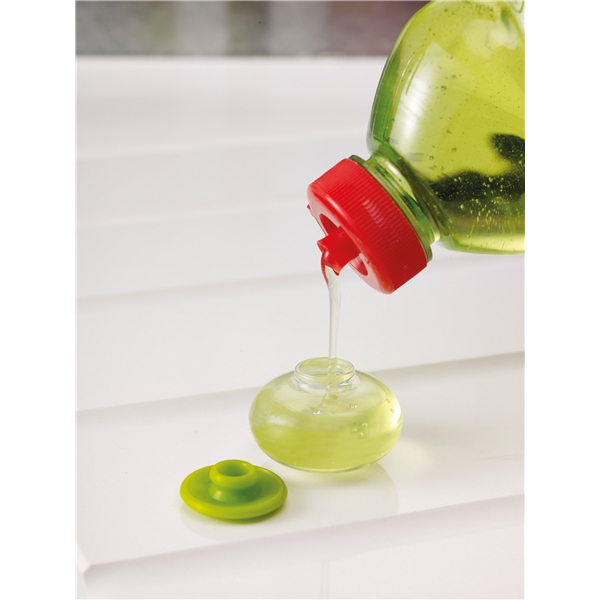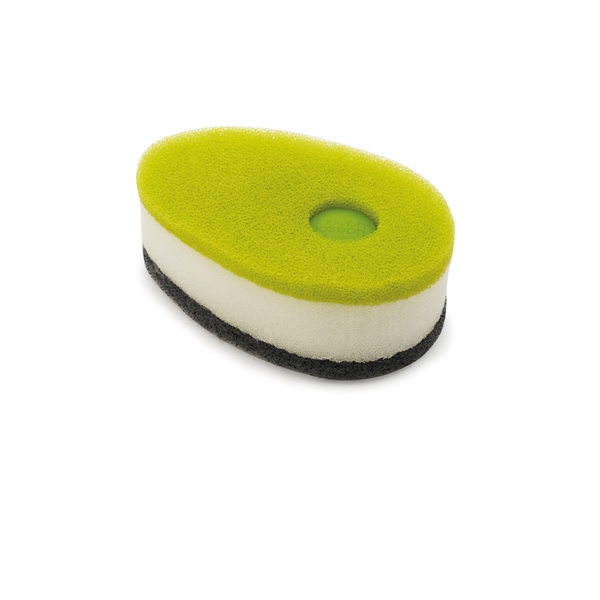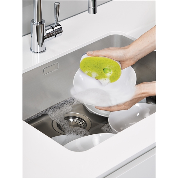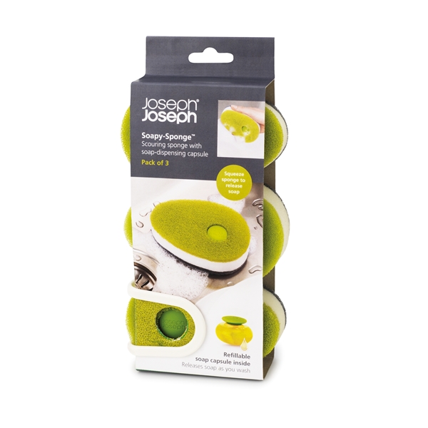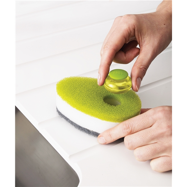 Spar på mængden af opvaskemiddel med Soapy-opvaskesvampen. Den langsomme gennemstrømning af opvaskemiddel gør at du ikke behøver tilføje mere opvaskemiddel mens du vasker op. Tryk kapslen ud, fyld den med opvaskemiddel og sæt den tilbage i svampen. Selve svampen har tre lag til forskellige rengøringsformål og leveres med en holder, der gør at svampen hurtigt tørrer på en hygiejnisk måde uden at efterlade pletter på køkkenbordet.