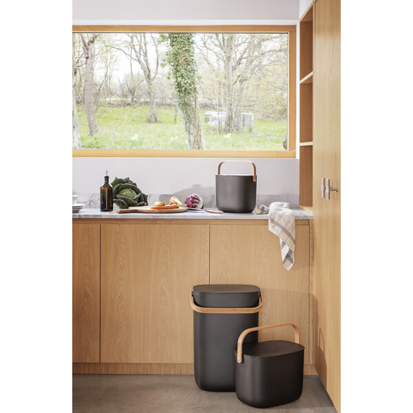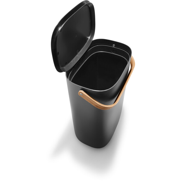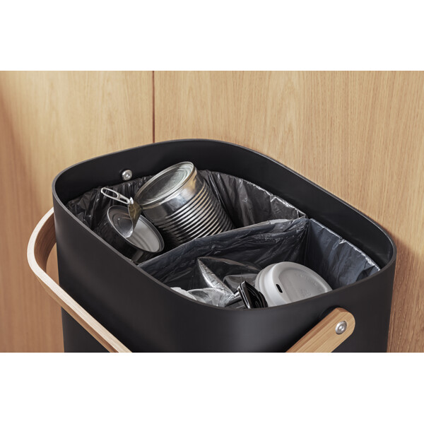 En skraldespand behøver hverken være grim eller gemmes væk. Vores elegante Reflect affaldssorteringsspand kan stå fremme som en del af indretningen, samtidig med at den gør det nemmere at holde hjemmet rent og pænt. Med en eller flere affaldssorteringsspande kan du aktivt mindske mængden af affald, der sendes til forbrænding, samtidig med at du støtter genbrug og kompostering ved at separere affald fra genanvendelige materialer som papir, plast, metal og glas. Spandene kan monteres på væggen eller stables, for at spare plads. Det smarte lågdesign gør det nemt at holde låget åbent, når du smider affald ud, da det automatisk griber og balancerer på spandens kant. Skraldespanden eliminerer desuden behovet for specialposer takket være den indbyggede poseholder, der hurtigt kan tilpasses forskellige posestørrelser. Det indbyggede håndtag gør det nemt at transportere affaldssorteringsspanden, som er fremstillet af miljøvenlig genanvendt plast og bambus.
