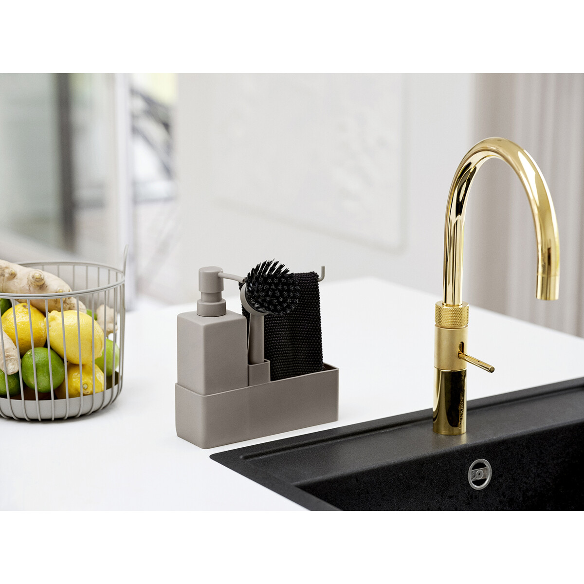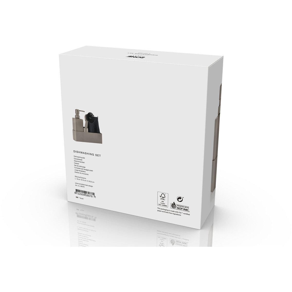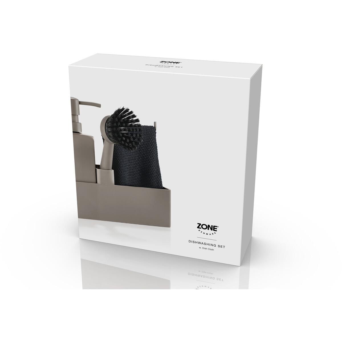 Zones populære alt i én-opvaskesæt med opvaskeklud. Sæbepumpen er lavet af robust keramik, og beholderen er i ridsefri silikone, som er let at rengøre. Børsten kan stå selv, og børstehovedet kan udskiftes, så du altid har en frisk børste.