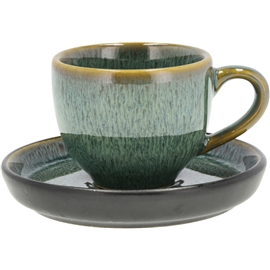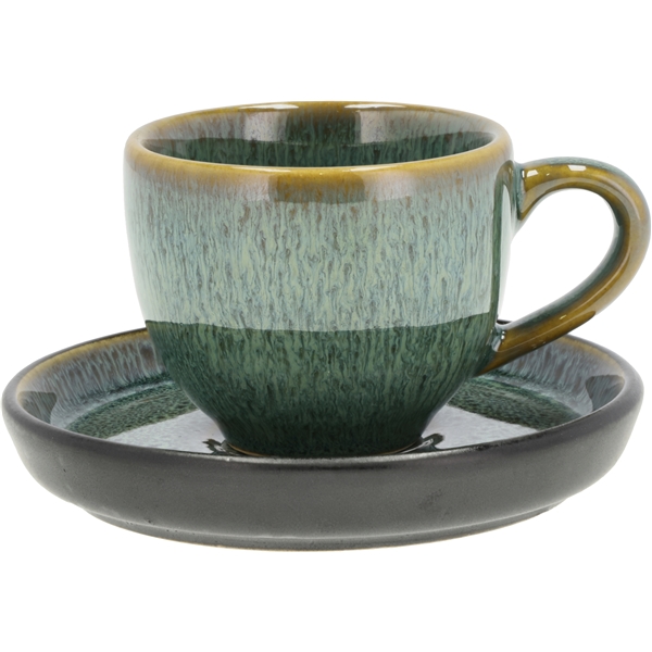 Fin espressokop med hank og matchende underkop i robust stentøj. Underkoppen har matsort glasur på undersiden mens oversiden har den samme blankt farvede glasur, der går igen på både ydersiden og indersiden af koppen. Rummer 7 cl. Diameter 5,5 x 5 cm. Stentøjet tåler opvaskemaskine, mikroovn og ovn op til 220 grader.