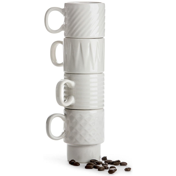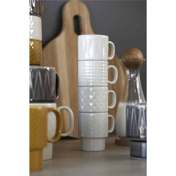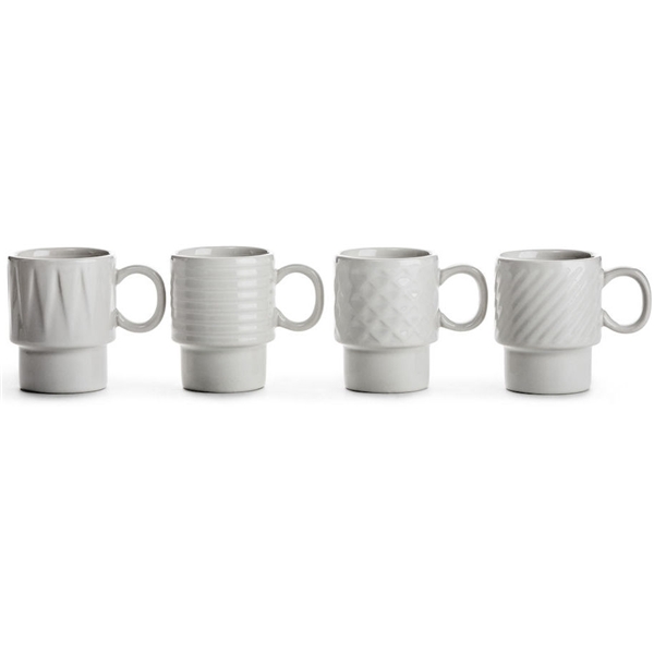 Espressokrus Pakke med 4 stk. med karakteristisk relief. Espressokruset er en del af serien Coffee & More, der er fremstillet af Sagaform i samarbejde med designeren Margot Marolo. Seriens design er en flirt med 1970'ernes direkte, legesyge og ligefremme sprog. Serien fås i forskellige dele, mønstre og farver og ser allersmukkest ud når det hele kombineres i en skøn blanding! Fungerer som espressokrus men er også perfekt som krus til gløgg. Tåler mikrobølgeovn og opvaskemaskine.