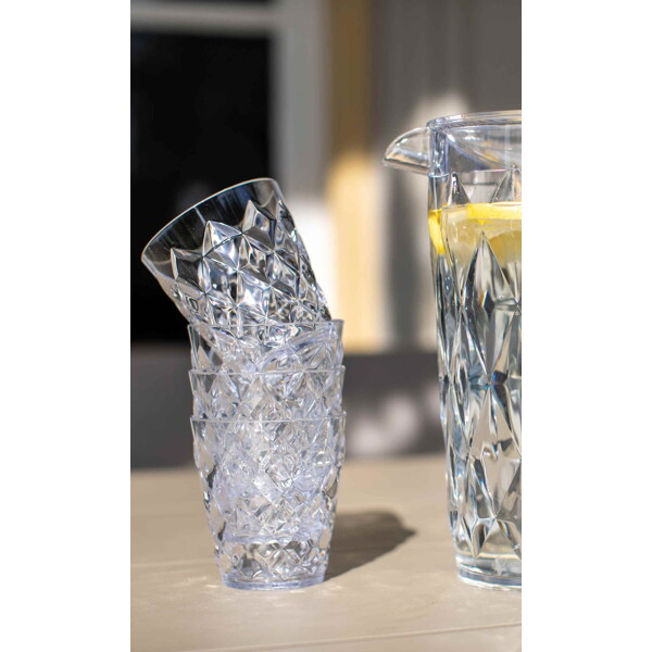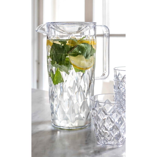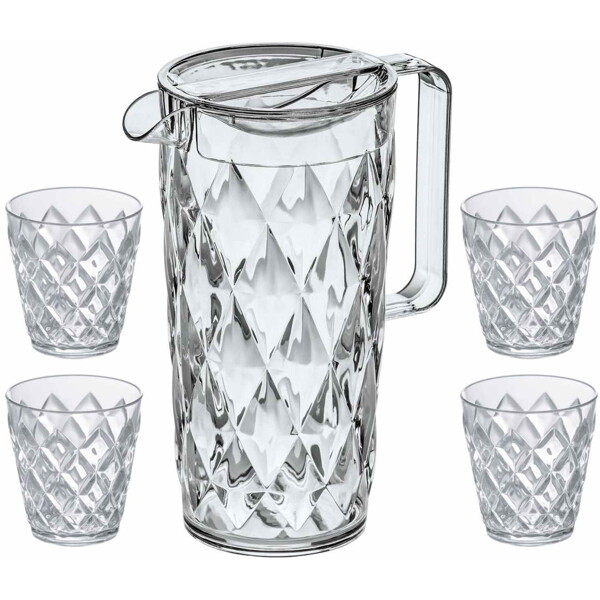 Flot sæt med CRYSTAL vandkaraffel 1,6 liter og fire matchende glas. Karaffel og glas tilhører den uknuselige plastglasserie Superglas fra Koziol, fremstillet i 100% genanvendelig og giftfri termoplast. Miljøvenligt design og fremstillet i Tyskland.