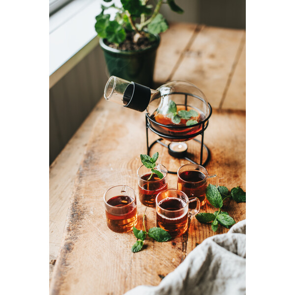 Elegant rund gløggkande i glas med sort metalstativ og plads til fyrfadslys. Holder gløggen varm og klar til servering hele aftenen. Perfekt til advent, julebord og vinterhygge. Rummer ca. 1,3 liter.