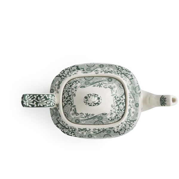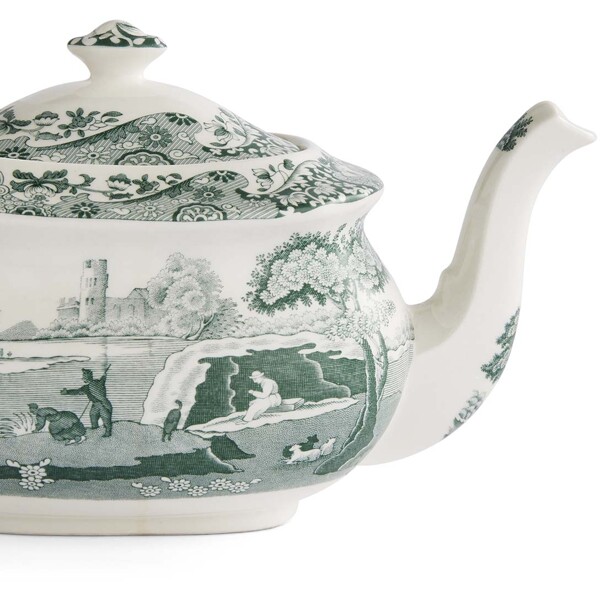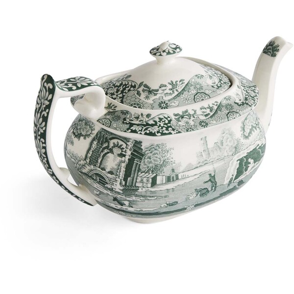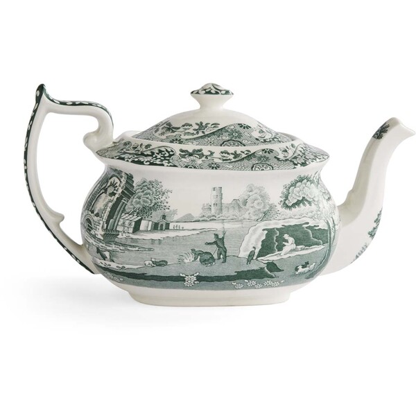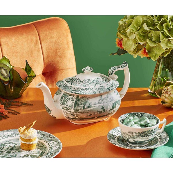 Heritage Green Italian Tekande 1,1 L er et elegant og funktionelt midtpunkt i enhver klassisk teservice. Mønsteret – kendt fra Spodes ikoniske Blue Italian – er her gengivet i en dyb, grøn nuance, der giver et nyt udtryk til en elsket original.Motivet skildrer det pittoreske italienske landskab, indrammet med det detaljerige 1700-tals Imari Oriental-mønster, der løber langs tekandens smukt buede form. Kanden har en generøs volumen på 1,1 liter, hvilket gør den perfekt til både hverdags eftermiddagste og festlige lejligheder. Den velafbalancerede tud og låget med knop sikrer en sikker og drypfri servering.Fremstillet i Stoke-on-Trent, England – hvor generationer af håndværkere har forædlet britisk porcelæn siden 1700-tallet.