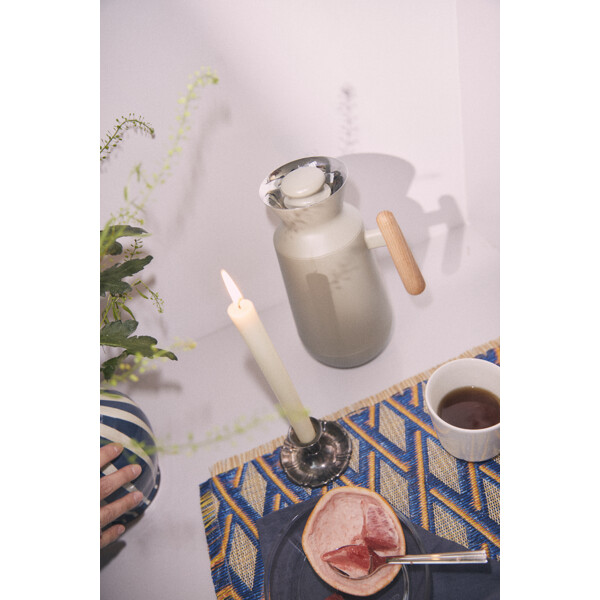Bold industrial møder klassiske konturer. Med Rosendahls nye termokander DayBreak og Stay Warm får du to nydesignede arketyper – den lille runde dråbeform og den ikoniske høje, slanke silhuet – skabt i en unik materialemix med bløde former og taktile overflader inspireret af naturen og tidens varme minimalisme. To nye favoritter til din stilfulde kaffepause og det store teselskab – til en stille og tidlig morgen alene eller til en herlig aften med venner. Klar når solen står op, og giver dig den bedste start på dagen – og et aromatisk øjeblik af stilhed inden dagen tager fart. Og trofast ved din side når samtalerne fortsætter og historierne bare bliver bedre og bedre og holder sig langt ind i natten. Med DayBreak-termokanden får du hverdagsmagi til alle livets øjeblikke i en smuk og majestætisk form. Den høje, slanke silhuet byder solopgangen velkommen og inviterer til en rigtig god kop kaffe at starte dagen med. Den rummer en liter, men hvad du fylder den med – og hvad du kalder den – bestemmer du helt selv. Det er din hverdag. Dine øjeblikke. Og selvom termokanden er fantastisk flot i sit udtryk, går du naturligvis ikke på kompromis med Rosendahls velkendte funktionalitet og høje kvalitet, uanset hvordan du bruger den. Med en blank inderside i rustfrit stål og et solidt håndtag i bøg får du den perfekte kombination af æstetik og komfort. Den intuitive hældekant modvirker dryp og gør det let at servere, uanset om du dækker op til frokost i køkkenet eller hælder varm te i en kop på skovturen. Det er innovativ og intuitiv design til alle livets øjeblikke. Hverdagsmagi i morgenens første kop, den trofaste ven til dagens små pauser og den velfortjente aftenkaffe eller te når roen indfinder sig. Din termokande er din ven for livet. Og Rosendahl er altid designet til livet der leves. Derfor er den naturligvis fremstillet i slidstærke materialer og med en form der tåler både hverdagens tempo og festens højdepunkter. Med inspiration hentet fra både antikkens keramik og moderne industriel design er Rosendahls termokander skabt i en komposition der taler til både øjet og hånden. Klassiske arketyper i moderne tekstur og tone, hvor taktile overflader og naturlige materialer forenes i et æstetisk udtryk der er både funktionelt og indbydende. Termokanderne passer ind overalt og løfter med deres enkle æstetik alle situationer hvor vi sænker tempoet og føler nærvær. Roen. Fællesskabet. Alle de øjeblikke der bliver hængende.