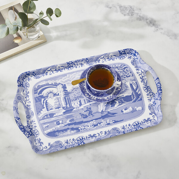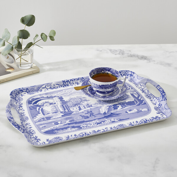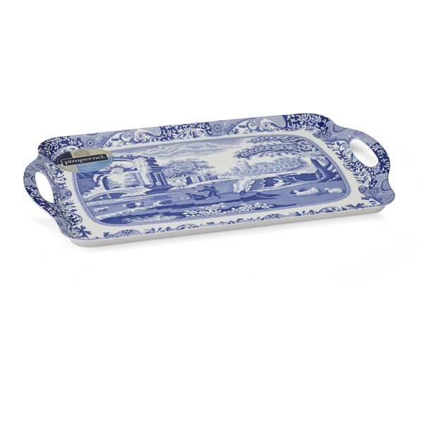 Blue Italian blev lanceret allerede i 1816 og er siden da blevet fremstillet af Spode. Detaljeret med inspiration hentet fra det ældre italienske landskab omgivet af en ramme af et 1700-tals Imari Oriental. Blue Italian Bakke med håndtag kan suppleres med en række andre artikler både porcelæn, tekstiler og bakker i den smukke og tidløse Blue Italian kollektion.