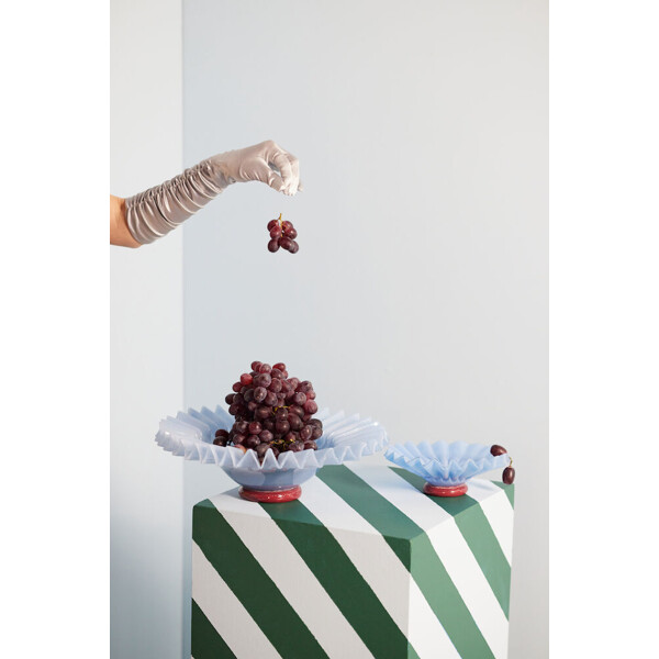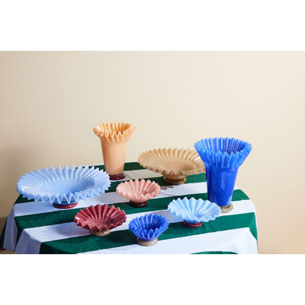 Med inspiration fra modeverdenens plisserede kjoler påminder formen om en blomst, der netop skal til at slå sine blade ud. De glaserede farver og den lave, runde fod, der står i kontrast til selve skålen, gør Lori til en genstand man ikke glemmer lige med det samme. Lori føles som glaskunst eller som barnlige karameller i glitrende karamelpapir. Uanset hvor Lori flytter ind, så gør skålen det med samme pondus som eksklusive trofæer. Lori-produkterne er håndlavede, hvilket sikrer, at hver eneste del er unik og har sit helt eget look. Lori L er en statement-skål, som gerne pynter smukt på egen hånd eller kan bruges til at rumme frugter eller en salat når du får gæster. Lori L er et vaskeægte kunstværk på bordet.