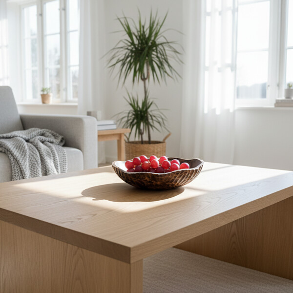 Unikt design: Har en fængslende kant og en tekstureret, snegleinspireret krop, der fremhæver de naturlige træårer.
