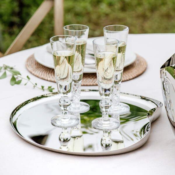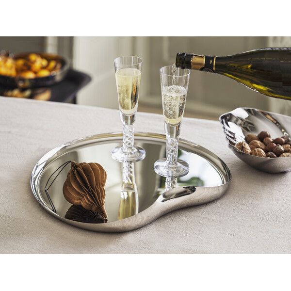 Robert Welch Drift serveringsbakke er en del af den prisbelønnede Drift-serie, som modtog *Excellence in Housewares – Top of the Table Award 2018*. Bakken er designet til at fremkalde en følelse af bevægelse, med organiske former og spejlpolerede overflader, der reflekterer omgivelserne og skaber liv i enhver borddækning.