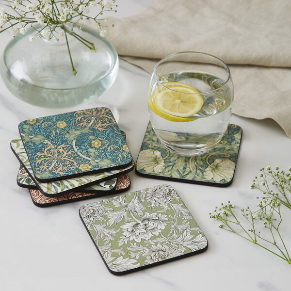 Disse glasunderlag fra William Morris & Co kombinerer praktikalitet med tidløs skønhed, med forskellige mønstre i hvert sæt. Glasunderlagene har en korkbund og er varmeresistente, hvilket beskytter dine overflader på en stilfuld måde. Underlagene er nemme at rengøre med en fugtig klud. En elegant og funktionel tilføjelse til ethvert hjem.