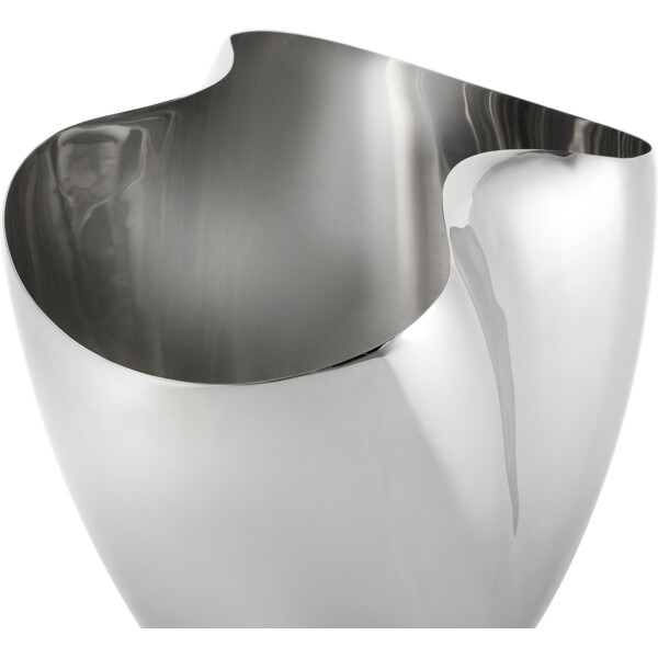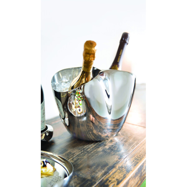 Køleren er fremstillet i højpoleret 18/10 rustfrit stål og er utroligt holdbar. Den bløde form bidrager med smukke lysrefleksioner og gør køleren til et naturligt blikfang og midtpunkt. Dette er den større model og måler 21,5 cm i dybden, 23 cm i højden og 28 cm i bredden.