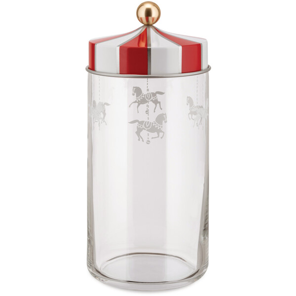 Design: Marcel WandersFremstillet i glas. Fås i fire forskellige størrelser. 'Circus'-seriekrukker med hermetisk tætsluttende låg der bruges til at gemme forskellige madvarer, som derved kan opbevares på en god måde. Her henter Marcel Wanders inspiration fra den fine dekoration på cirkusteltets store top. Låget er dekoreret med den traditionelle røde farve og hvide striber på messingmarkiser, og resultatet er ganske fortryllende. Wanders forvandler klassiske køkkenkrukker til smukke og glade opbevaringskukker, som pryder køkkenet på en fantastisk måde.