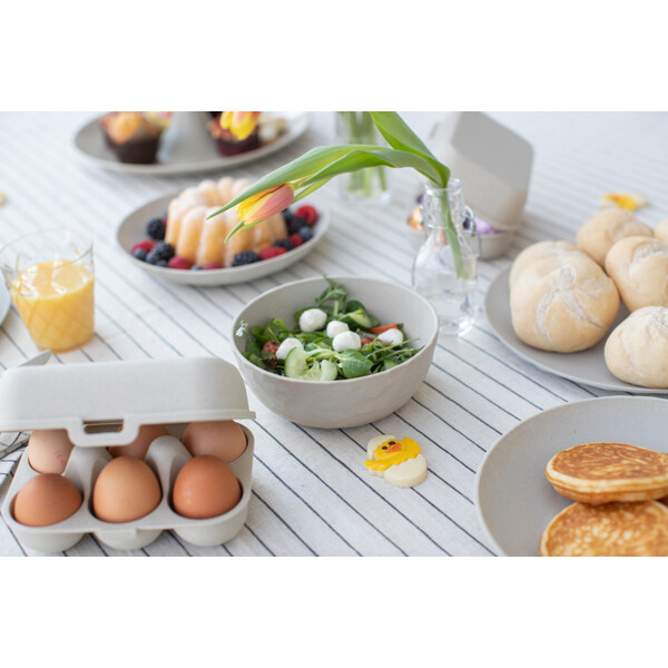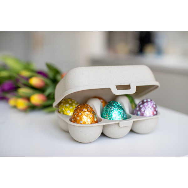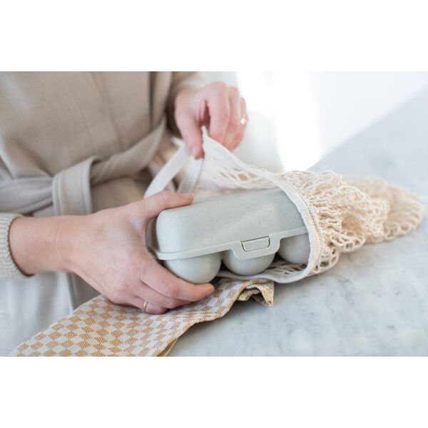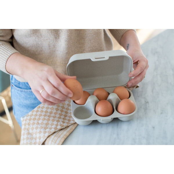 Æggebakke til 6 æg, fremstillet i 100% genanvendelig miljøvenlig biocirkulær termoplast og træfiber - perfekt til indkøb på bondens marked. Kassen er sikker og stabil og har et låg med kliklås. Det stødresistente materiale holder æggene garanteret hele. Kan stables, så du sparer plads i køleskabet.