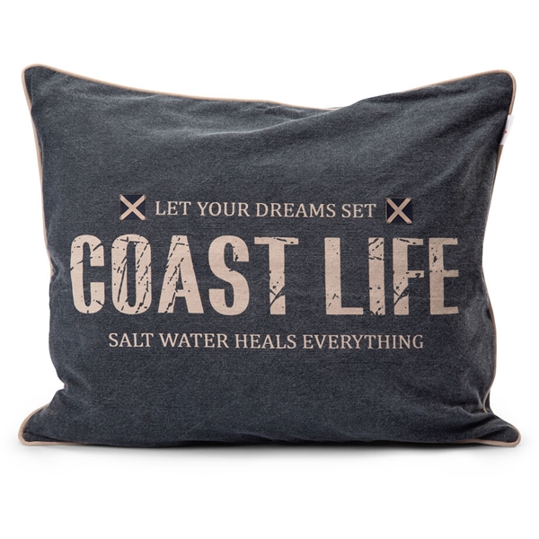 Pudebetrækket Engesberg fra Lord Nelson i maritime farver med et stort tryk på forsiden med teksten "Let your dreams set, coast life. Salt water heals everything". Et stort og flot pudebetræk som er perfekt til at understrege den maritime indretningsstil.
