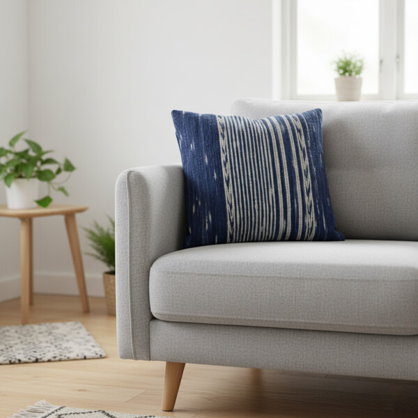 Design: Distinkt indigofarve med detaljerede flettede striber for et rigt, tekstureret udseende. Håndlavet Kvalitet: Hvert betræk er omhyggeligt fremstillet og viser unikke variationer og ægte håndværk, hvilket sikrer, at dit eksemplar er virkelig unikt. Alsidig Indretning: Perfekt til boheme, kystnære, rustikke eller moderne interiører og forbedrer nemt dit hjems æstetik.