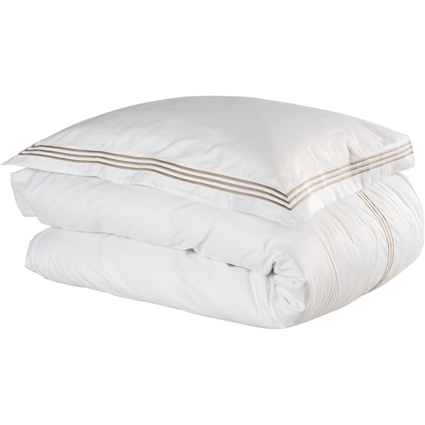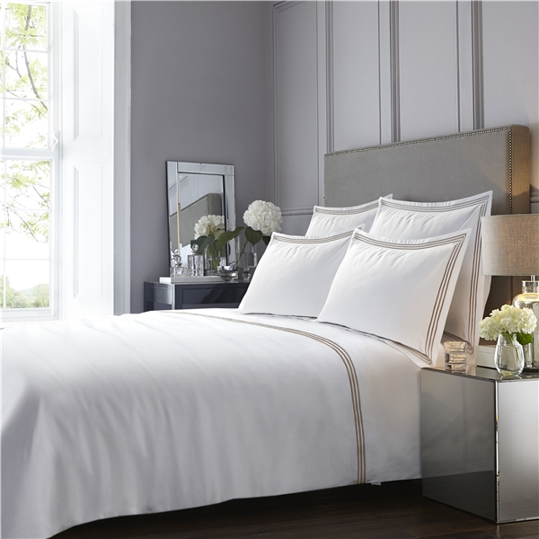 Bedford-sengetøj af 100% bomuld i vores mest luksuriøse kvalitet. En ekstra blød og kølig bomuldssatin med 300 tråde. Hvis du vil skabe en neutral hotelstemning på dit soveværelse er Bedford helt klart noget for dig. Bedford ses ofte på de sociale medier og anvendes flittigt af influencere. Du har sikkert allerede set det online. Pudebetrækket har en detaljeret vinge med tre broderede linjer i kontrastfarve, mens dynebetrækket har samme linjer broderet i horisontal retning over den forreste del af toppen. Satinkvaliteten karakteriseres af at stoffets overflade er en smule glansfuld, hvilket skaber et eksklusivt look på dit soveværelse. Ved fremstilling anvendes udelukkende det bedste og mest langfibrede bomuldsgarn, som er certificeret med OEKO-TEX® 100 Standard (klasse 1). Dynebetrækket har en skjult knaplukning, mens pudebetrækket har en såkaldt hotellukning.