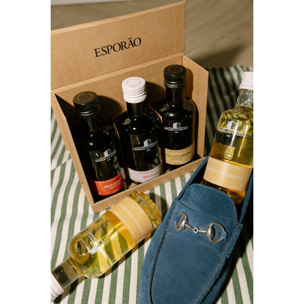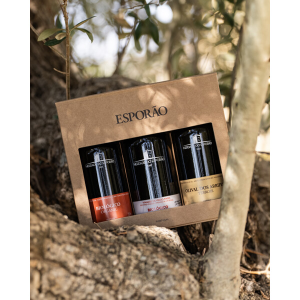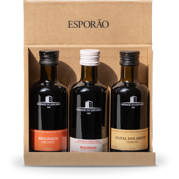 Værdsat gaveæske indeholdende to stykker økologiske olivenolier med to forskellige karakterer samt en økologisk rødvinseddike.