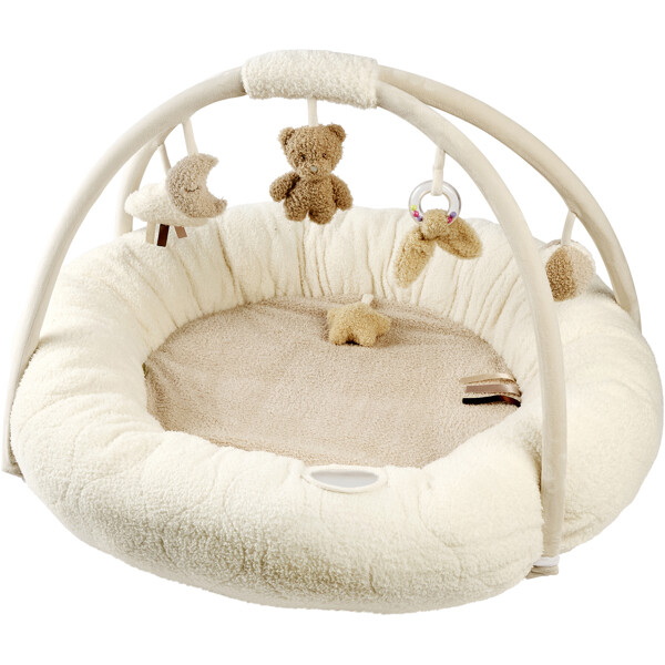 Nattou legetæppe med bue er en blød, plysset legeplads, hvor dit barn føler sig trygt og komfortabelt. Den tykke polstrede kant og legebue med plysdyr, rangler, spejle og andre tilbehør inviterer dit barn til at gribe fat i, udforske og lege. Griberefleks og sensoriske færdigheder stimuleres gennem leg, mens dit barn også kan slappe af på det bløde tæppe. Buen er aftagelig, så tæppet kan også bruges alene.ProduktspecifikationerBabylegetæppe: 90 × 90 × 48 cm (L x B x H)Materiale: 100 % polyesterInkluderer polstret kant, aftagelige buer med plysdyr, rangler, spejle og tilbehørPleje: tæppet kan maskinvaskes ved 30 °C, buer aftagelige med spænde (må ikke tørretumbles)