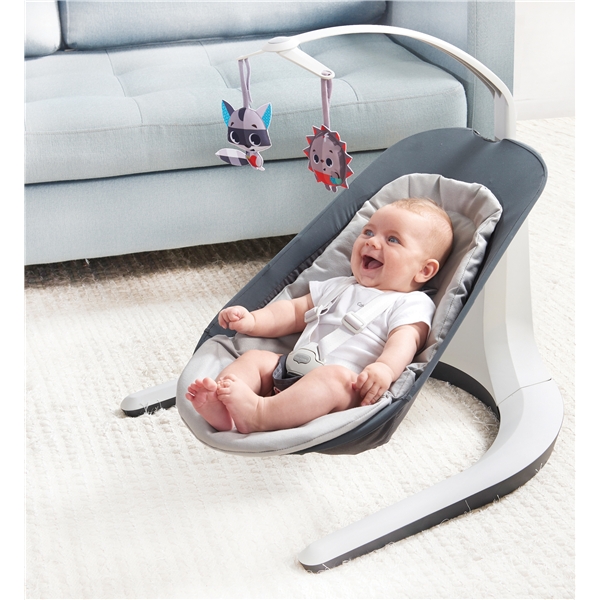 Tiny Love Meadow Days Bounce & Sway - Denne innovative og patenterede skråstol tilbyder en perfekt kombination af beroligende gyngerier og underholdende hop for din baby. En mobile indgår for at stimulere babyens nysgerrighed og give underholdning. Alle bevægelser er naturlige og skabes enten af at barnet bevæger sig eller af forældrenes hænder. Skråstolen tilbyder et udvalg af 19 melodier i 3 forskellige kategorier og afspiller 25 minutters kontinuerlig musik. Sædet er polstret, let at vaske og hurtigt at montere. Kan anvendes til børn på op til 9 kg.