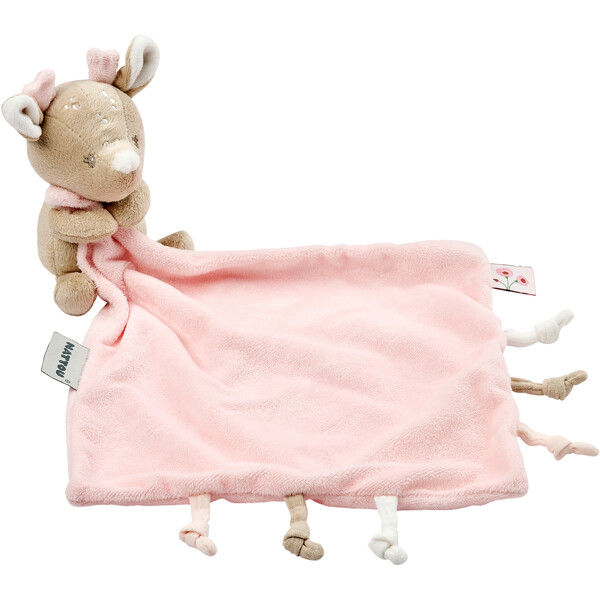 Dette bløde babyklud fra Nattou med et hjorteformet tøjdyr vil blive dit barns uadskillelige ven fra fødslen. Den bløde velour giver en vidunderlig hyggelig følelse og tilbyder tryghed, selv for for tidligt fødte børn. Takket være sin lette vægt og mange grebsmuligheder kan små hænder nemt gribe denne hyggelige klud, kramme den og tage den med overalt. Den lille hjort tilbyder komfort i svære stunder og giver ro under lure eller på farten. En fortryllende doudou, der ikke bør mangle i barnets outfit og er også en vidunderlig babygave.Produktspecifikationer:Blød krammeklud i form af en hjortSærligt velegnet til nyfødte og for tidligt fødte børnMange grebsmuligheder, perfekt til små babyhænderMål: 38 x 16 x 48 cmMateriale: tetrabomuld og blød velourLet at vedligeholde: maskinvaskbar ved 30°C, må ikke tørretumbles