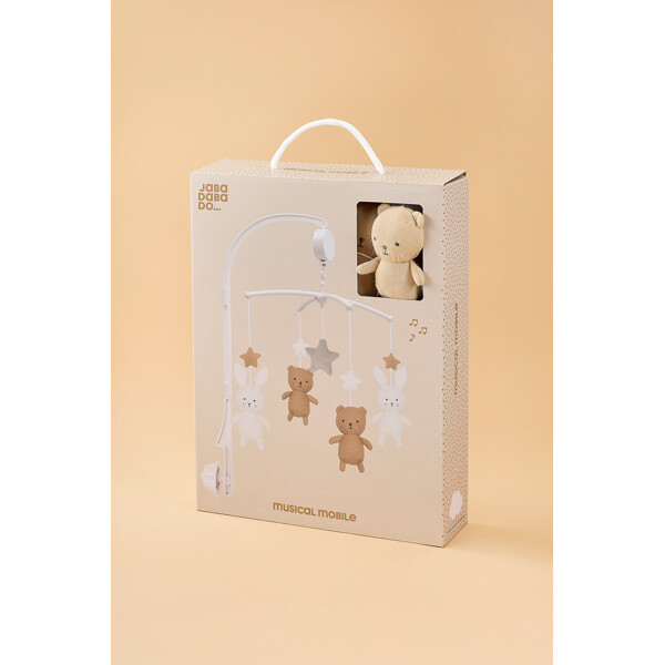 JaBaDaBaDo Musikmobile Teddy & Bunny er en sød sengemobile i blød tekstil, som afspiller en vuggevise og drejer sagte rundt. Musikmobilen er perfekt at hænge over puslebordet eller tremmesengen for at underholde barnet. Den har søde figurer i form af bamser og kaniner, der stimulerer barnets syns- og høresans samtidig med at babyen bliver underholdt. Musikmobilen er fremstillet af det blødeste musselinvævede bomuld, og fyldet er af polyesterfibre.