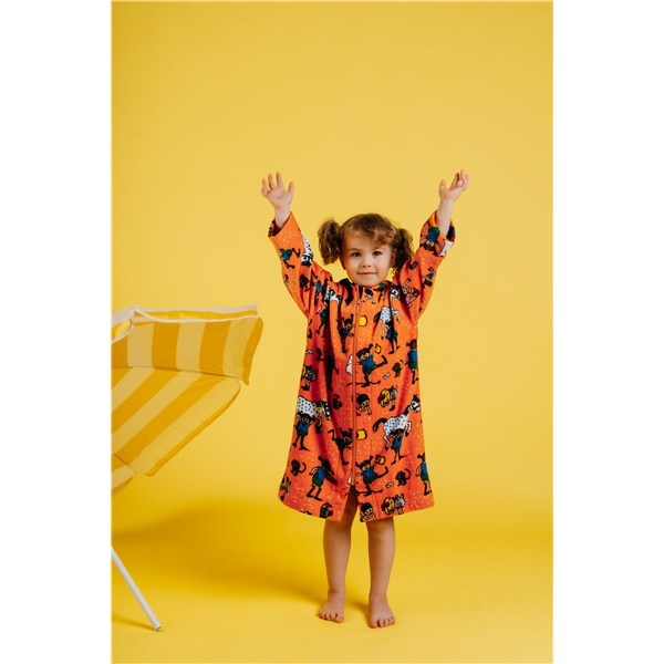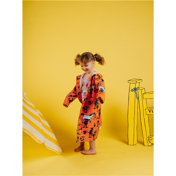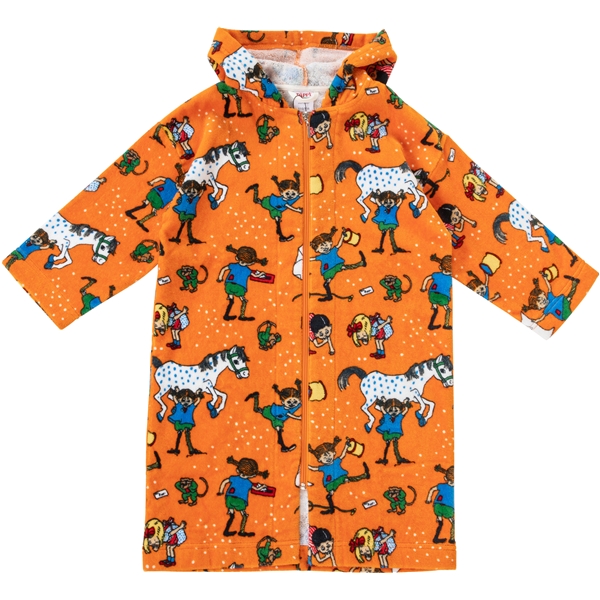En varm orange badekåbe med et roligt Pippi Langstrømpe mønster. Badekåben er blød og behagelig og syet i ét stykke, uden sidesømme. Den har hætte, ophængningsøje i nakken og lynlås foran.