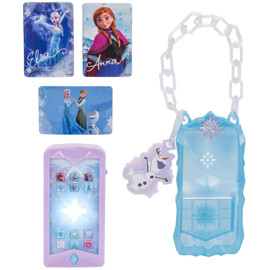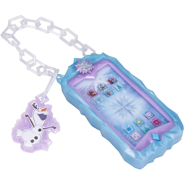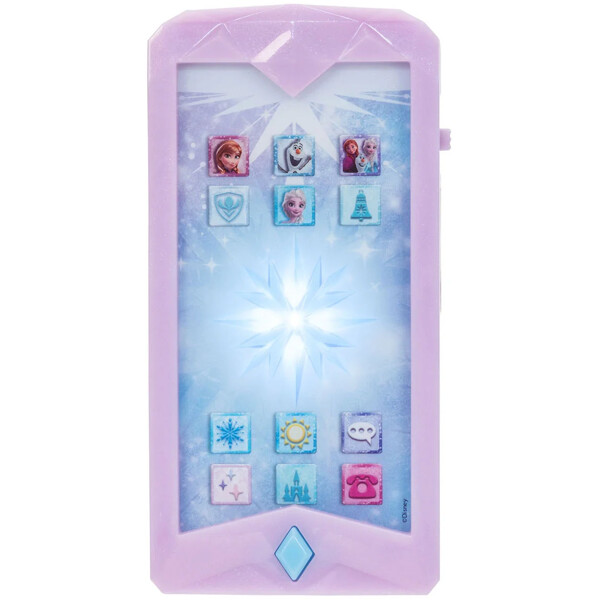 Børn kan trykke på knapperne for at høre magiske lydeffekter, sange og fraser fra Elsa – mens telefonen lyser op med glitrende snefnug.