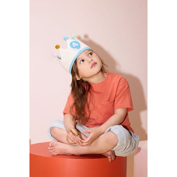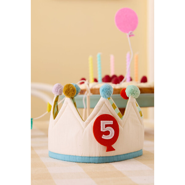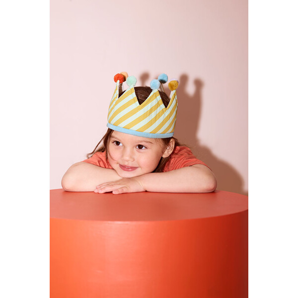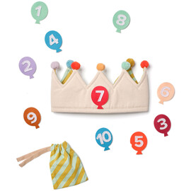 Foran er der plads til at fastgøre tal fra 1 til 10 med velcro, så kronen nemt kan bruges igen og igen. Indersiden er stribet i diagonalt mønster, og foroven sidder små pomponer som en legesyg detalje.