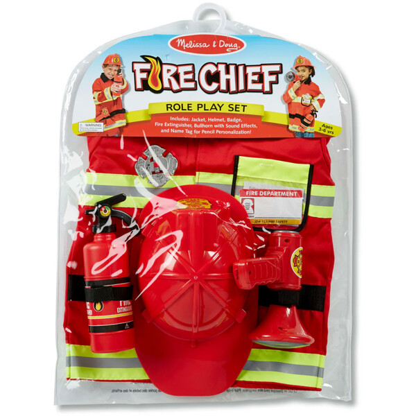 Sættet indeholder en klar rød jakke, der kan maskinvaskes og har refleksdetaljer for øget realisme. En brandchefshjelm er også inkluderet, sammen med en "brandslukker" og en megafon, der giver lydeffekter for at forbedre legeoplevelsen.
