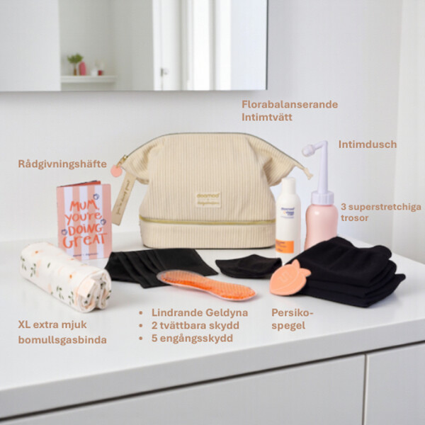 Indhold – 8 vigtige produkter til hospitalstasken:Intimbruser – skånsom rengøring under og efter fødslenXL ekstra blød bomuldsgasbind – GOTS- og Oeko-Tex-certificeret, for høj komfort3 superfleksible trusser – passer størrelse 36–52, holder beskyttelser på pladsLindrende Gelpude – lindrer og giver behagelig aflastning2 vaskbare beskyttelser + 5 engangsbeskyttelser – alle Oeko-Tex-certificerede for tryg anvendelseDoomoo Shinncare Florabalanserende Intimvask – hjælper med at holde intimområdet friskt og balanceretFerskenspejl – turde se og tage sig af dit intimområde med kærlighedRådgivningshæfte – tips og støtte til at frigøre tankerne og mindske stressen
