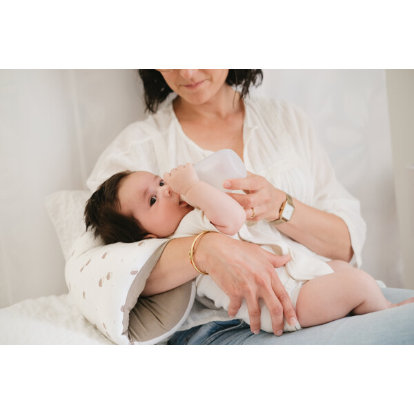 Gør måltiden lettere både hjemme og på farten! Tinéo Ammepude er en smart, ergonomisk armpude, der giver behagelig støtte til både dig og din baby ved amning eller flaskemadning. Den er kompakt, let og nem at tage med i pusletasken – perfekt til rejser, udflugter eller hverdagen derhjemme. Puden er designet til at bæres direkte på underarmen og giver en blød og stabil støtte til babyens hoved, samtidig med at den aflaster dit håndled og arm.Perfekt til nybagte forældre, der ønsker et praktisk hjælpemiddel både hjemme og på farten.Egenskaber:Ergonomisk støtte – Mindsker belastningen på arm og håndled ved madningKompakt og let – Ideel til rejser, udflugter eller besøg hos familie og vennerBlødt og behageligt stof – Fremstillet i 100 % bomuld med fyld i 100 % polyesterLet at tage med – Passer i pusletasken eller håndtaskenPasser fra nyfødt (0m+) – Kan bruges fra første dag