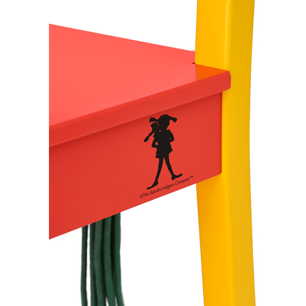Bagsiden af stolen har en grøn "hestehale" af bomuldssnor. Og et af benene er malet i klar gul farve, uventet og lidt skørt, men er det ikke sådan, vi ser Pippi...? En praktisk møbel med masser af personlighed, perfekt for alle, der, ligesom Pippi, synes det er værd at prøve nye ting.