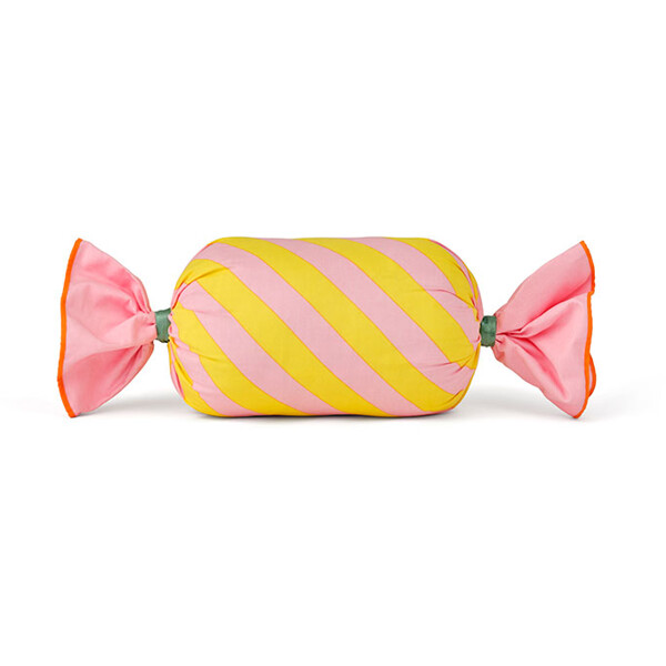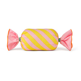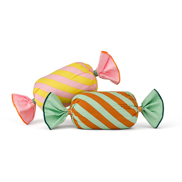 Denne pude minder om klassiske indpakkede karameller – måske en sådan som Pippi købte den dag... En blød, cylinderformet pude med knyttede ender. De skrå striber giver et legende men enkelt udtryk, der liver op uden at overtage rummet.