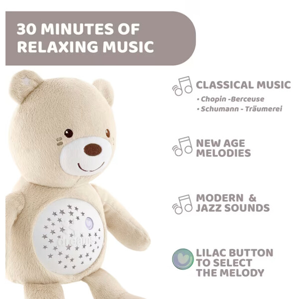 Udover funktionen som natlampe tilbyder bamsen 30 minutter med klassisk musik, jazz, soft rock, moderne musik, new age og naturlyde – med en knap til at vælge din favorit.