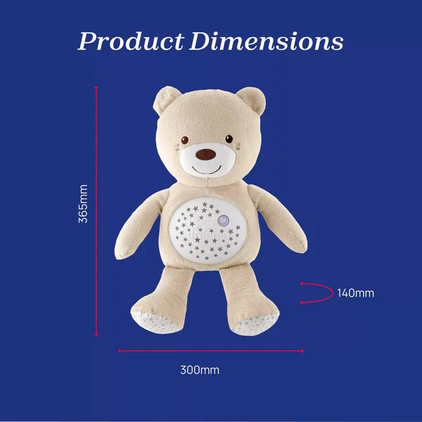 First Dreams Baby Bear er et blødt og venligt krammedyr fra Chicco, som også fungerer som en projektor med spektakulære lyseffekter og afslappende melodier til din baby.