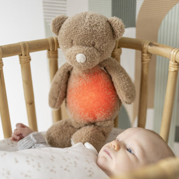 Denne søde natlampe med sin fine pels erobrer alle babyers hjerter. Med sine mange grebspunkter som ører, arme eller halstørklæde tilbyder tøjdyrret masser af muligheder for at fremme motorikken og følesansen. Den integrerede natlampe med sine 7 naturlige farvetoner og en spilledåse med hvid støj, hav, hjerteslag og vuggevise har en beroligende effekt og fremmer dermed barnets fredfyldte indsovning. Derudover har tøjdyrret en detekteringstilstand, der spiller bløde melodier i 15 minutter, når barnet begynder at græde.Sødt design med ører, poter og hale til at gribe, lege og krammeIntegreret natlampe med 7 farver og spilledåse med beroligende melodierOp til 8 timers autonomi og automatisk detektering, når barnet græderMateriale: plys 100% polyesterStørrelse: 19 x 10 x 33 cmLampen er ikke vaskbar, betrækket er maskinvaskbart ved 30°C