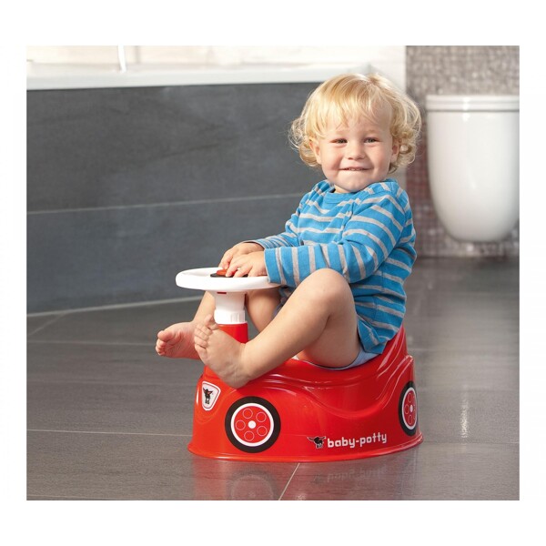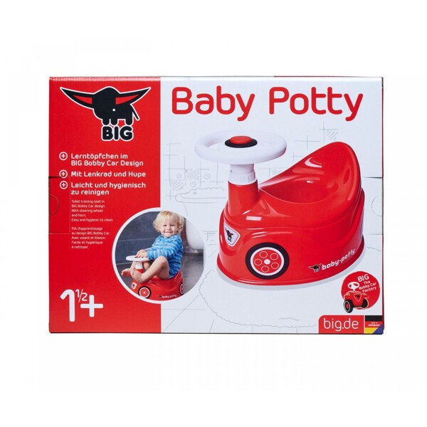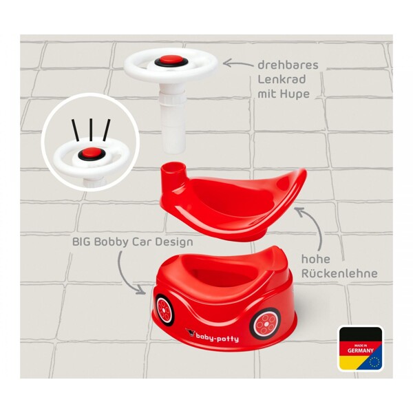 Fra nu af kan pottetræningen være afslappet og stressfri med BIG-Baby-Potty - fordi den sjove potte, der er integreret i BIG-Bobby-Car-designet, også gør pottetræningen sjov. Med sin lighed med den populære BIG-Bobby-Car-Classic har den røde potte med drejelig rat en næsten magisk tiltrækningskraft på små børn. Det børnevenlige sæde med høj rygstøtte gør selv de længste træningssessioner komfortable og afslappede.