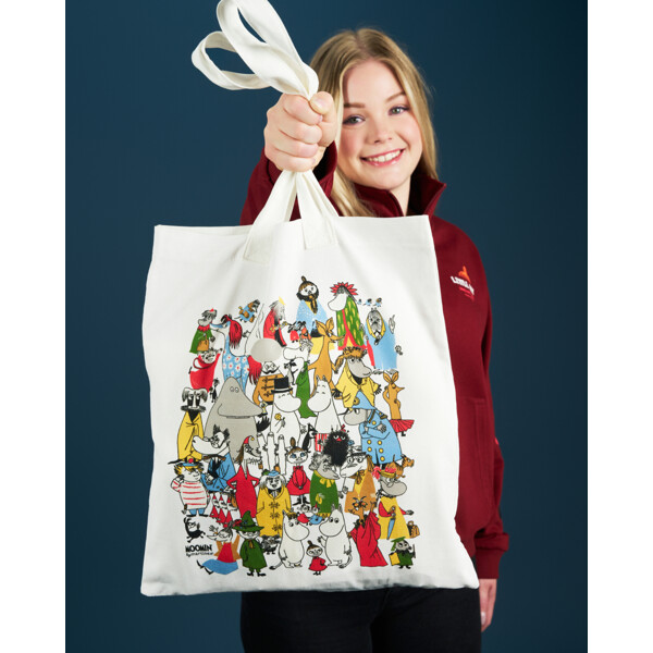 En praktisk Mumitask i slidstærk bomuldscanvas, med et farverigt tryk på forsiden. Kan bæres i hånden eller over skulderen. Fremstillet i genanvendt bomuld.
