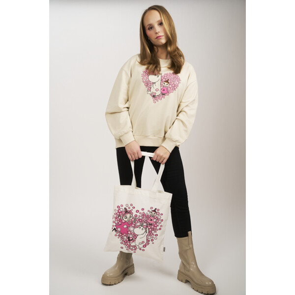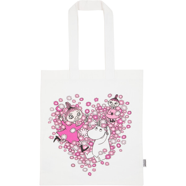 Fin og praktisk stofpose i solidt lærredsstof fremstillet af genanvendt bomuld og genanvendt polyester. Forsiden af posen er dekoreret med et hjerte med Mumi-figurer. De solide håndtag kan bæres i hånden eller over skulderen. Perfekt for dig, der ønsker at reducere brugen af plastikposer.