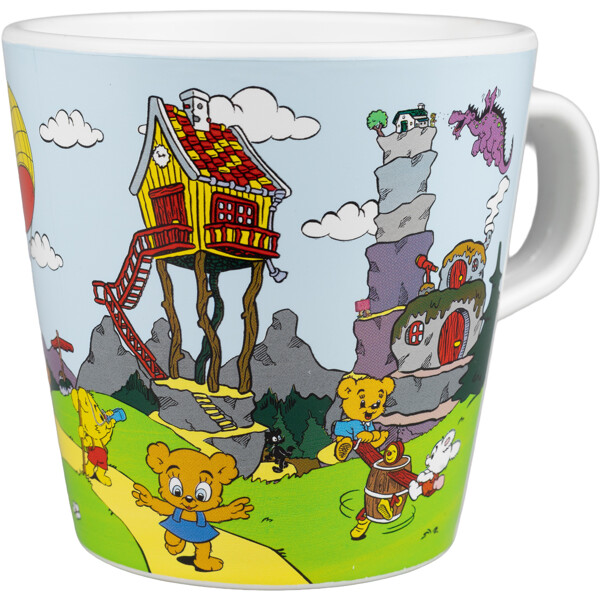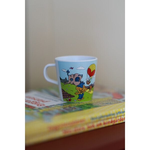 Krus med et håndtag med Bamse-motiv, fremstillet i RPET, hvilket er et miljøvenligt og holdbart materiale.