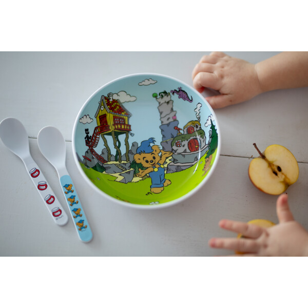 Dyb skål med Bamse-motiv, fremstillet i RPET, hvilket er et miljøvenligt materiale.