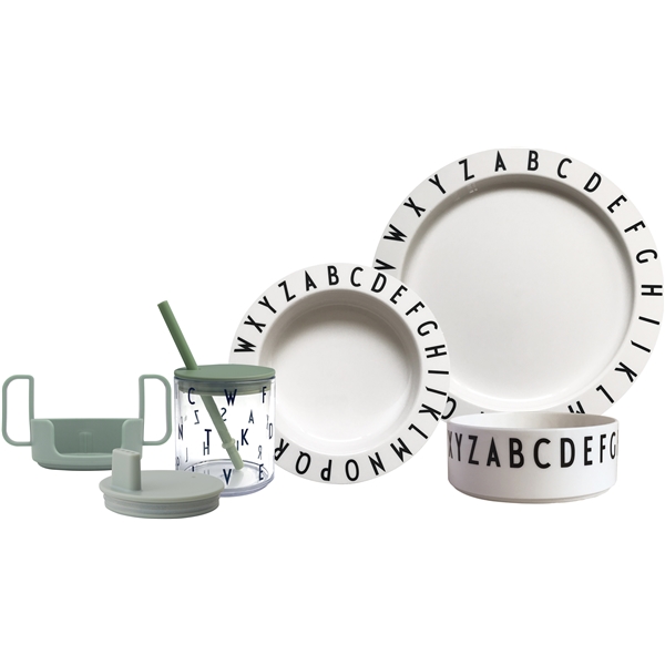 I setet ingår det en stor mattallerken, en djup tallerken, en skål samt ett glas med tillhörande lock och sugrör, piplock och dubbelhandtag. Tallerkenarna er vita med bokstäverna A-Z och lär barnet bokstäver samtidigt som de äter. Glaset er tillverkat i tritan och kommer med flera tillbehör som gör at barnet kan använda glaset under många års tid. Börja med handtaget och piplocket som sedan kan bytas ut till sugröret eller utan något när barnet kan dricka helt på egen hand.