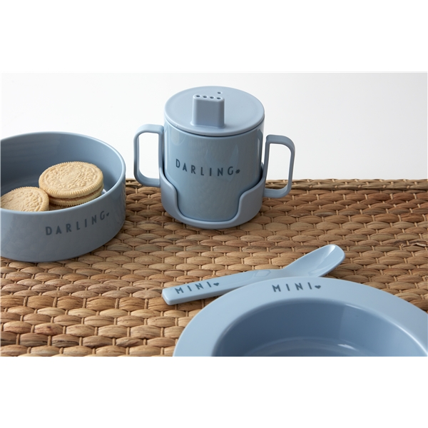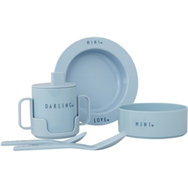 Design Letters Mini Favourite Starter Set er et fint startsæt med alt hvad du behøver til dit barn fra det er baby og op til skolealderen. Koppen kan først anvendes med låget og hanken, og når barnet bliver større kan delene nemt fjernes så koppen kan bruges alene. Skeerne leveres i to størrelser: baby og junior. Den dybe tallerken og skålen passer perfekt til alle barnets måltider og kan senere anvendes som skål til morgenmad og mellemmåltider når barnet bliver større.