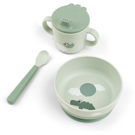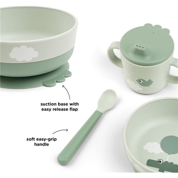 Små børn vil nyde hvert eneste måltid, der bliver serveret i dette søde Foodie First Meal Set med et legesygt motiv. Den praktiske sugebund holder skålen på plads, og skeen har en funktion, der er nem at gribe fat om, og som gør det behageligt for barnet at spise.