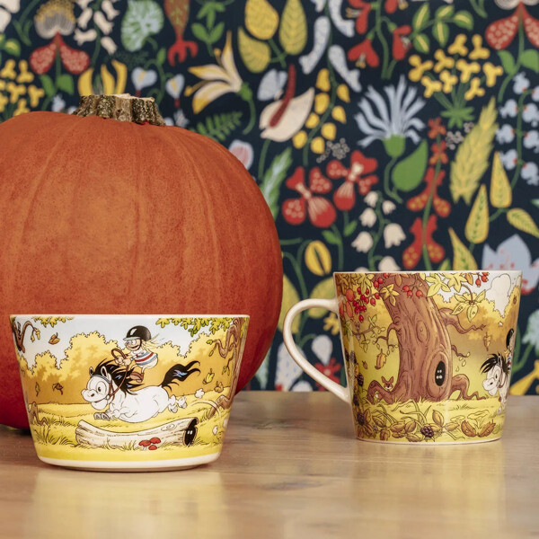 En hvid porcelænsskål, der rummer 3,5 dl. Udsiden af skålen er fuldmønstret med Lena Furbergs herlige efterårsmotiv af Hesten Mulle på skovtur blandt svampe og blade.
